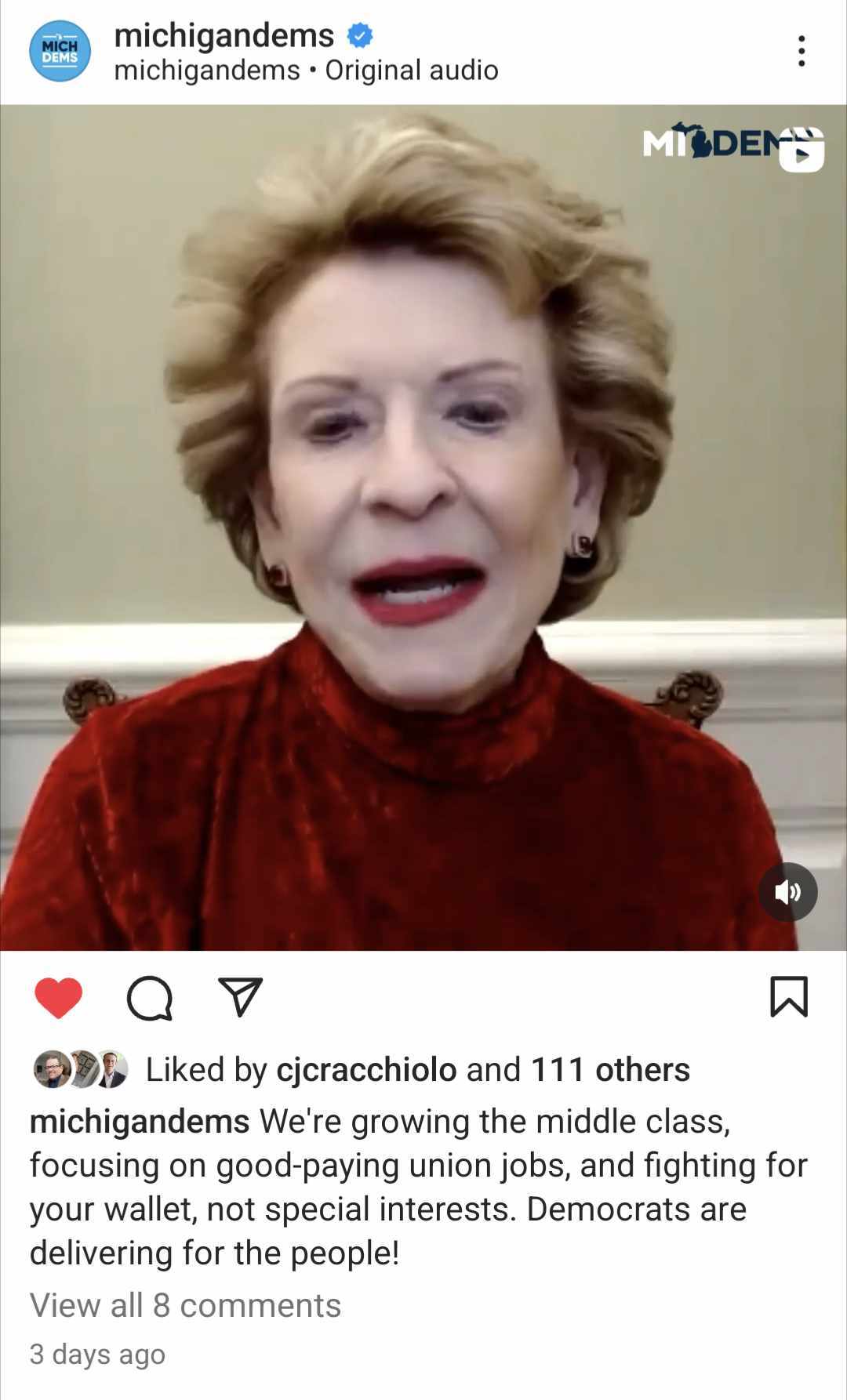 Our Meme this week is a great short video of Senator Stabenow talking about the economic gains that have been achieved over the last few years under President Biden. It comes from the Instagram account of the Michigan Democratic Party. Her fighting spirit is on full display.