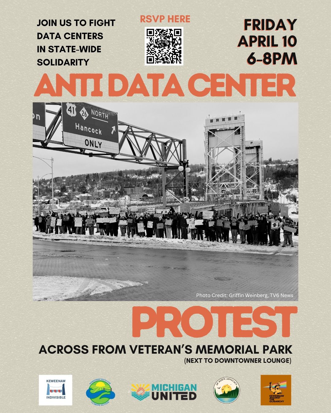 This protest, organized by Michigan United and partners, will take place at Veterans Memorial Park in Houghton next Friday, April 10th starting at 6 PM. Say no to data centers and demand passage of the Data Center Regulation Act (HB 5594–6).