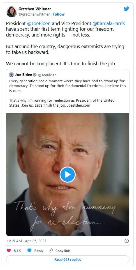 NEW: Gov Whitmer Named National Co-Chair of the Biden Re-election Committee