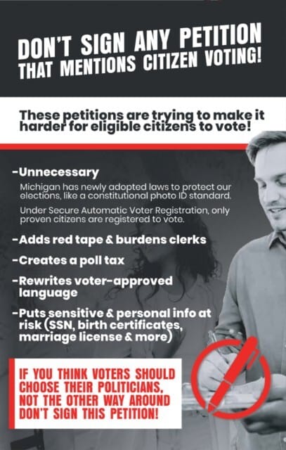 Just a reminder that there are two petitions circulating that we urge you to DECLINE TO SIGN. Both petitions are couched in language purporting to protect our right to vote, but both are unnecessary, and are actually voter suppression tactics that will harm Michiganders’ right to vote.