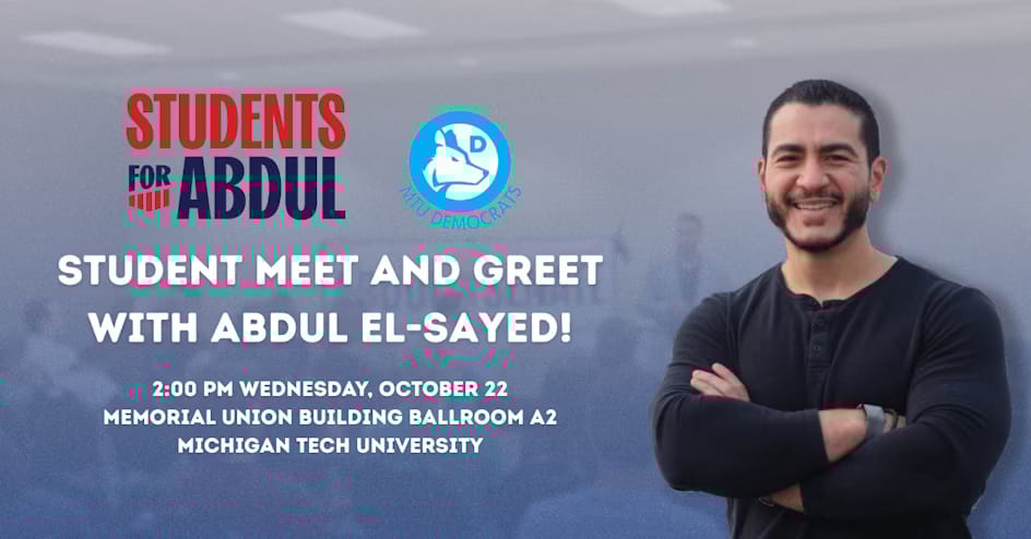 Abdul El-Sayed (https://abdulforsenate.com/), Democratic candidate for the US Senate, will be on the campus of Michigan Tech Wednesday, October 22nd for a student-led Meet & Greet. The public is invited. The event will take place in the Memorial Union Building, Ballroom A2.