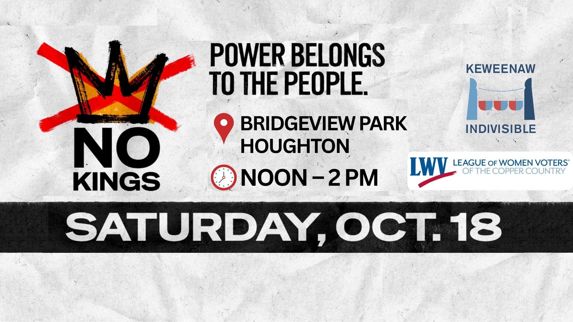Come on out and rally on Saturday the 18th for No Kings 2.0 in the Copper Country, organized by Keweenaw Indivisible and the League of Women Voters of the Copper Country. The rally event will be held at noon on October 18th.