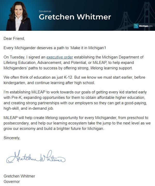 Governor Whitmer has been active this past week though. Beyond signing the executive order establishing MiLEAP, as covered in the item above, Governor Whitmer took the following actions:
