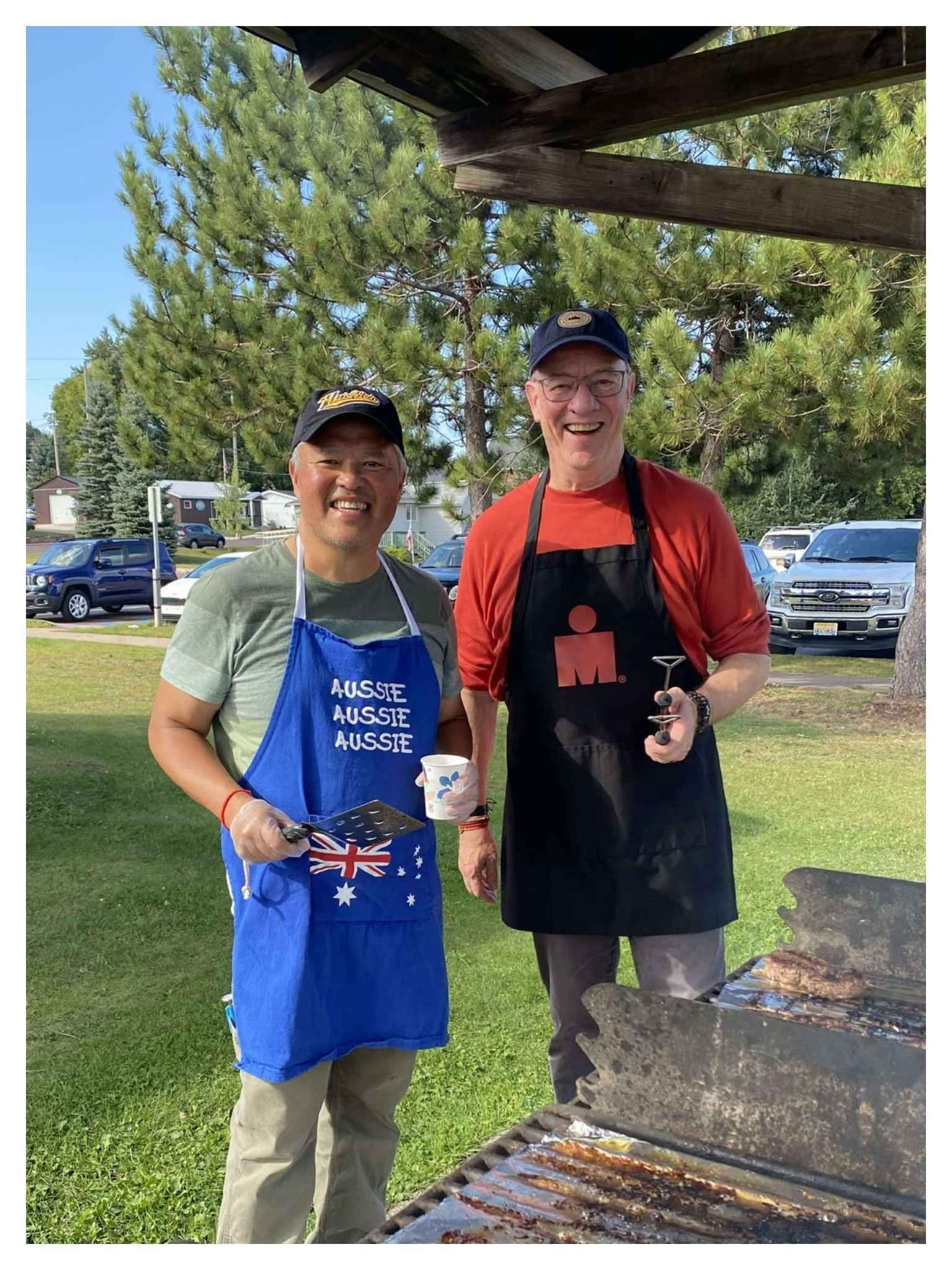 Volunteer grill masters Tony Villa-Real and Steve Blackburn