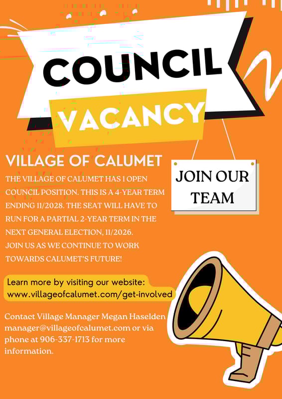 The Calumet Village Council has a vacancy for a Council seat that will be appointed to serve through November 2026.