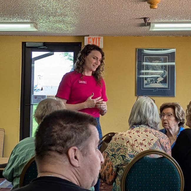 She spoke about her background growing up in northern lower Michigan, her husband’s military service, and her career as a lawyer. She is the only candidate in the race who is a native of the district, and thus feels herself uniquely able to address the issue of carpetbagging by the current office holder.