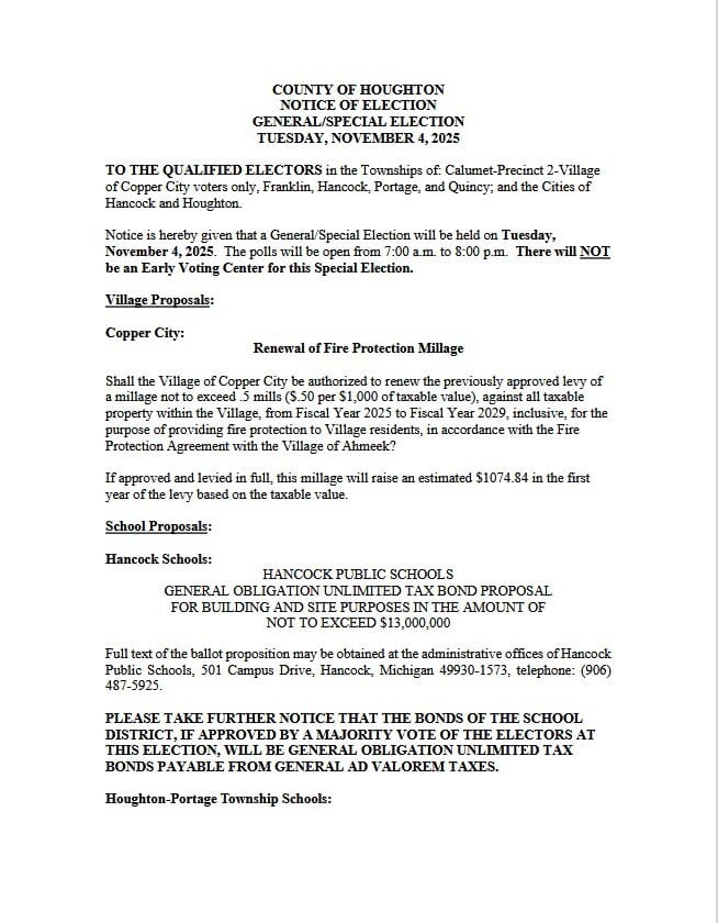 Voters in the village of Copper City, the townships of Franklin, Hancock, Portage, and Quincy, and the Cities of Hancock and Houghton have ballot proposals to consider and vote on.