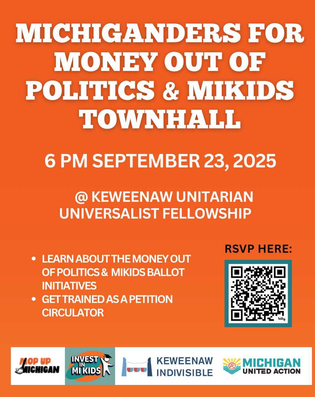 September 23 @ 6 PM (TONIGHT) | Money Out of Politics & Invest in MI Kids Town Hall @ Keweenaw Unitarian Universalist Fellowship |