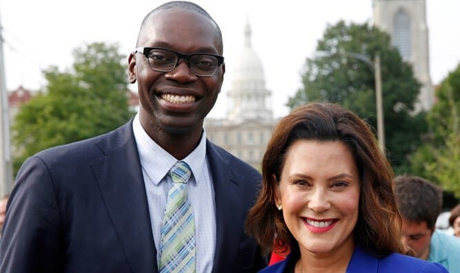 Lt. Gov. Gilchrist poses with Governor Whitmer near the Capitol in this undated photo from the Progressive Voter’s Guide