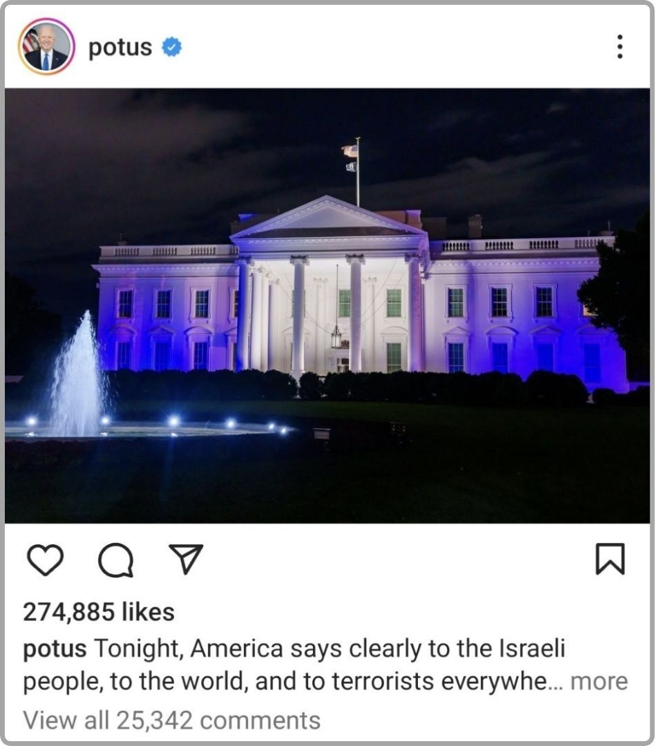 Our Meme of the Week comes from the official account of the President on Instagram, featuring the White House lit in the colors of the Israeli flag as a show of solidarity on the evening of October 9th. This photo was repeatedly seen on social media in posts from accounts around the world.