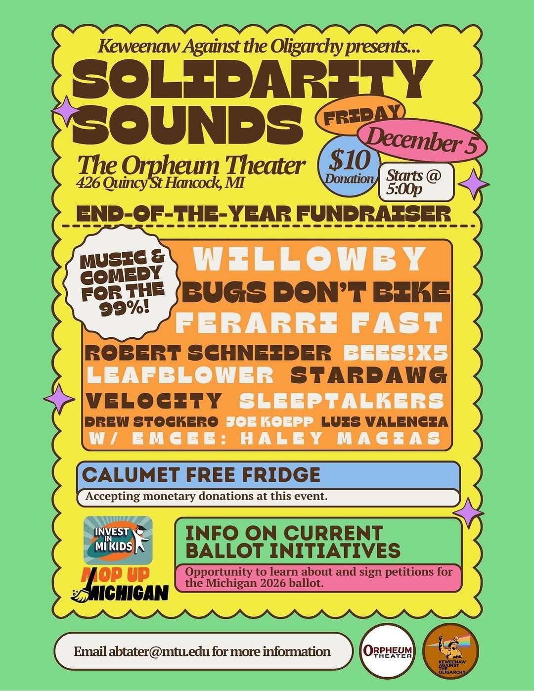 Keweenaw Against the Oligarchy (KATO) is holding an end-of-year fundraiser at the Orpheum Theater. The event starts at 5 PM this Friday. Stop by to see the bands and comedians who have committed to perform and volunteered for the cause!