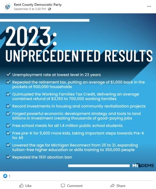 This week’s meme comes from the Facebook account of the Kent County Democratic Party. Like many Democratic social media accounts around the state, KCDP reposted what the MI Dems first posted at the end of August, and it’s well worth sharing. We’ve been posting about “Good Things Happening in Lansing” all summer, and this post highlights some of the unprecedented results that Democratic majorities in the state legislature have achieved this year.