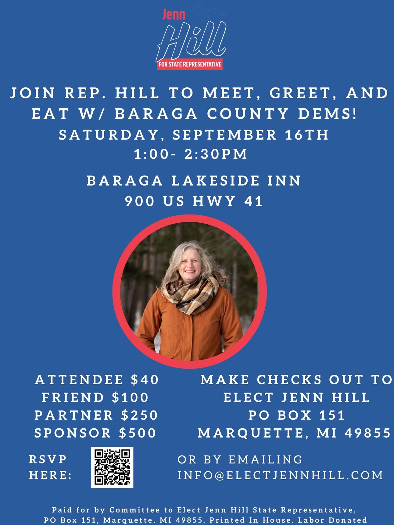 Join our friends the Baraga County Dems at a Meet, Greet and Eat with Jenn Hill on Saturday September 16th from 1 PM until 2:30 PM. Jenn is running for State Representative in the 109th District, representing Alger, Baraga, Marquette and part of Dickinson Counties.