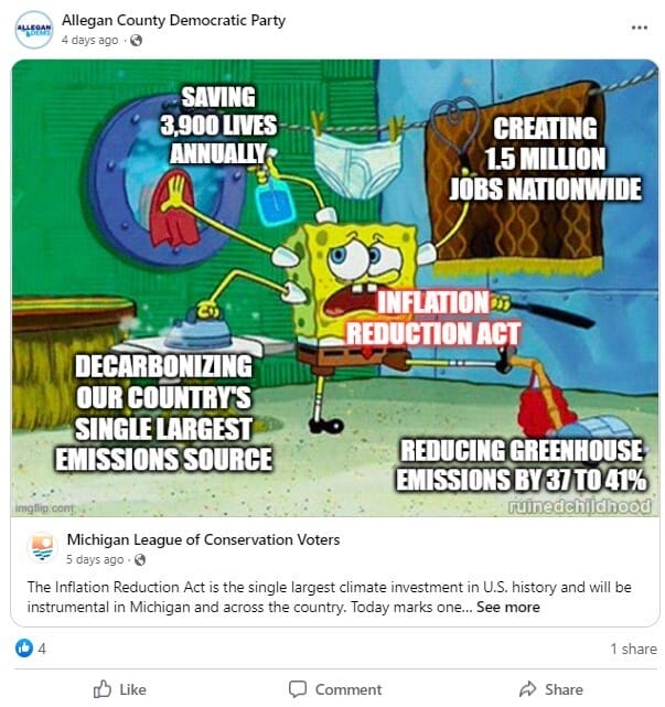 The Meme of the Week was posted on Facebook by the Allegan County Democrats, who shared a post from the Michigan League of Conservation Voters. The meme uses a picture of Sponge Bob Square Pants to celebrate the one year anniversary of the Inflation Reduction Act on August 16th. Like Sponge Bob in this shot, and like President Biden in his first term, the Inflation Reduction Act has been getting the job done!