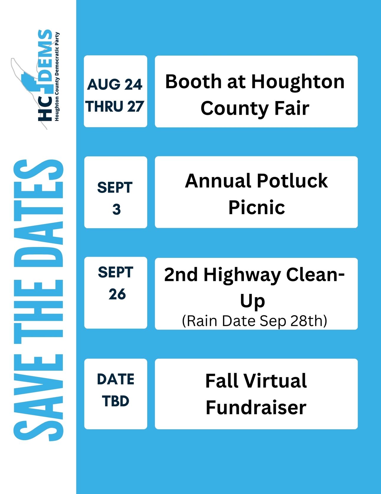 We are still looking for volunteers to staff our Houghton Dems booth at the County Fair this Thursday, August 24 through Sunday, Aug 27. Booth hours will be 5 PM too 10 PM Thursday, 11 AM to 10 PM on Friday and Saturday, and on Sunday from 11:30 AM to 5 PM. Volunteers will need to cover at least a two hour shift.